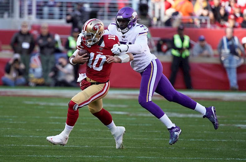 El mariscal de campo Jimmy Garoppolo lanzó pase de touchdown en su primer intento como titular de playoffs y los 49ers de San Francisco vencieron 27-10 a los Vikings de Minnesota en la etapa de división de la Conferencia Nacional.