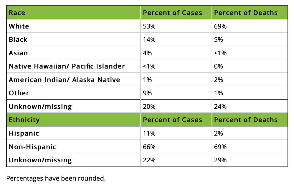 Una nueva gráfica del MDH muestra cómo la curva de casos registrados continua en ascenso; siendo el 5% de estos casos han sido detectados como Hispanos, 3% de las muertes también han sido identificadas como Hispanos. Resalta que son entre 20 años y 44 años las personas que más casos registran hasta el momento.