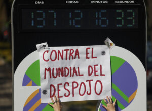 “El Mundial trae un sinnúmero de consecuencias que van desde la contaminación, el desplazamiento forzado de familias populares, comunidades y pueblos originarios, el despojo de bienes comunes como el agua o el aumento del costo del alquiler en un 155 %”, denunció Diana, joven encargada de leer el manifiesto junto al reloj en el céntrico Bosque de Chapultepec y que marca la cuenta regresiva en la capital para que comience el torneo de fútbol.