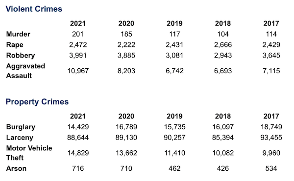 - El robo de vehículos motorizados aumentó un 8.5% en 2021 con 14 829 vehículos robados en comparación con 13 662 en 2020. El total de 2021 es el más alto desde 2001. Además, hubo 779 incidentes de robo de vehículos en 2021, el primer año en que se recopilaron estos datos. Los incidentes de robo de vehículos no se cuentan como robos de vehículos motorizados.