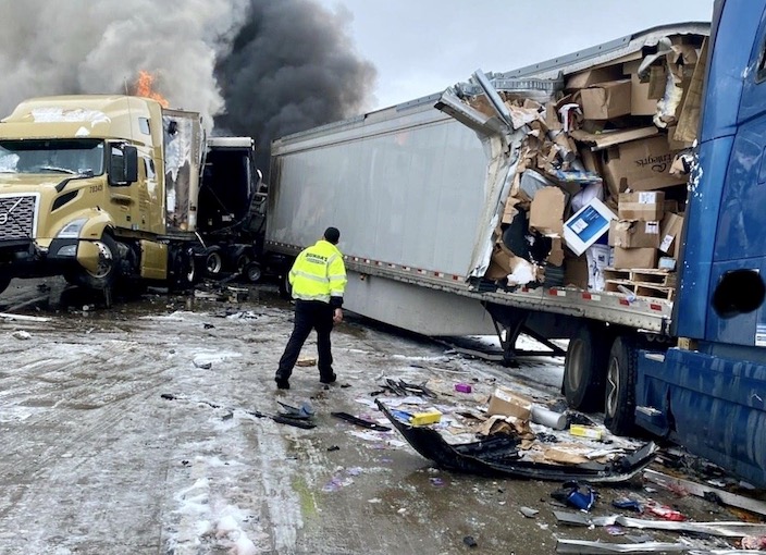 Los investigadores de la Patrulla Estatal de Minnesota están buscando información sobre un camión semirremolque de cabina blanca y un remolque blanco que pudo haber detenido en la Interestatal 94 cerca de Wright County Road 18 en el carril de tráfico antes del choque de reacción en cadena que involucró a 29 vehículos.