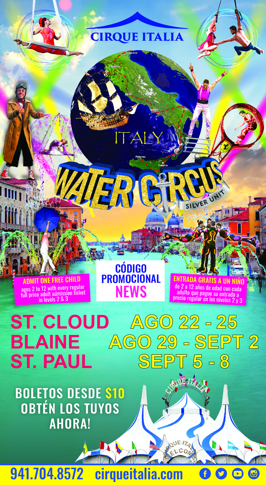 Pues en su más reciente producción, Cirque Italia trae las ciudades italianas hasta ti mientras su majestuoso velero navega de puerto en puerto… ¡No pierdas tu oportunidad de abordarlo en SAINT PAUL, MN del 5 al 8 de Septiembre!