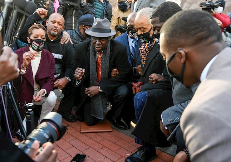 La familia y sus abogados se arrodillaron frente al juzgado durante 8 minutos y 46 segundos, el tiempo que Chauvin apretó su rodilla contra el cuello de Floyd mientras el afroamericano, tendido en el suelo y esposado llamaba a su madre y repetía: “¡No puedo respirar!”.