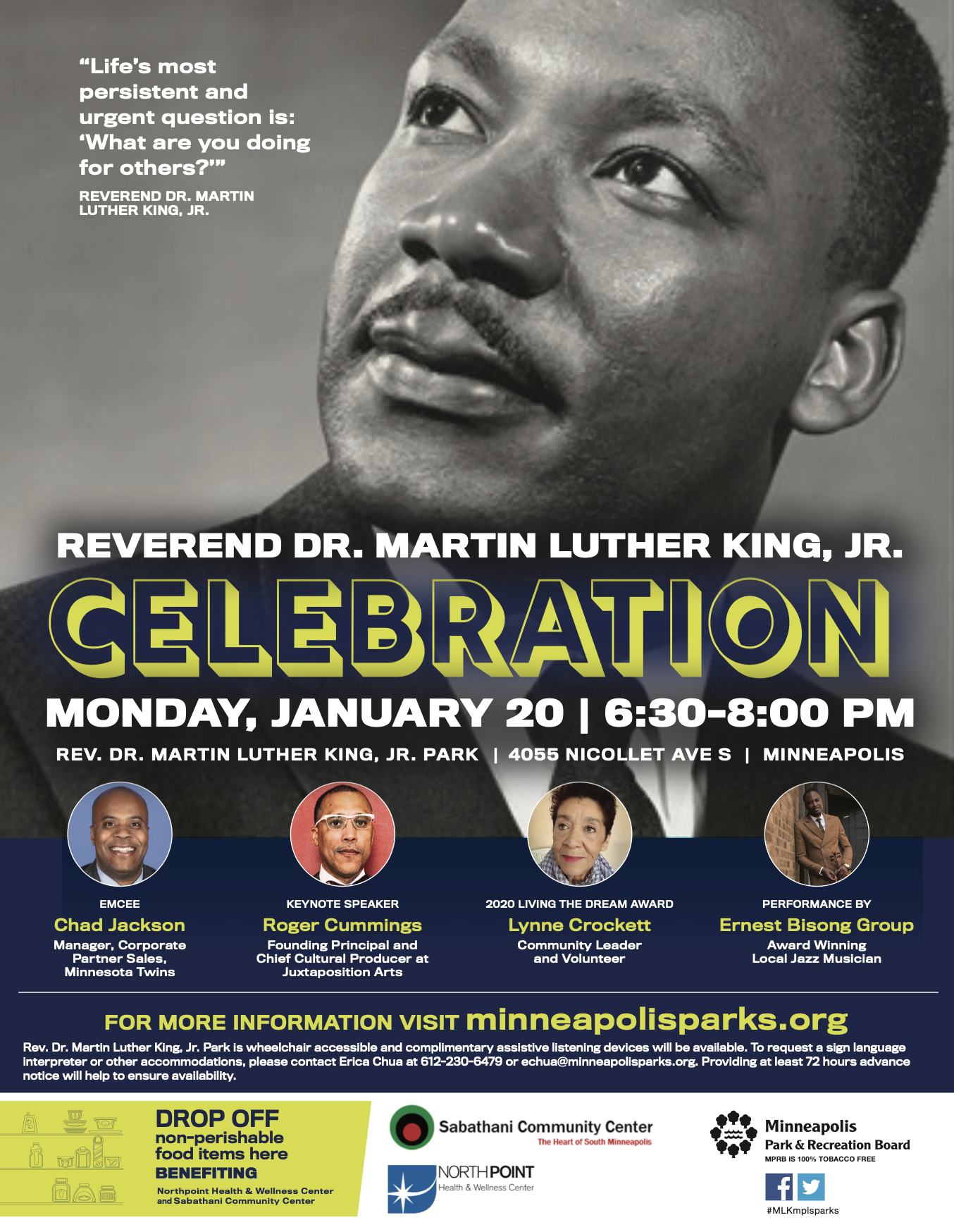 La celebración también marcará la conclusión del décimo anual “Feed the Dream” Food Drive. Se anima a los residentes a donar alimentos no perecederos a su centro de recreación local MPRB durante todo el día 21 de enero.