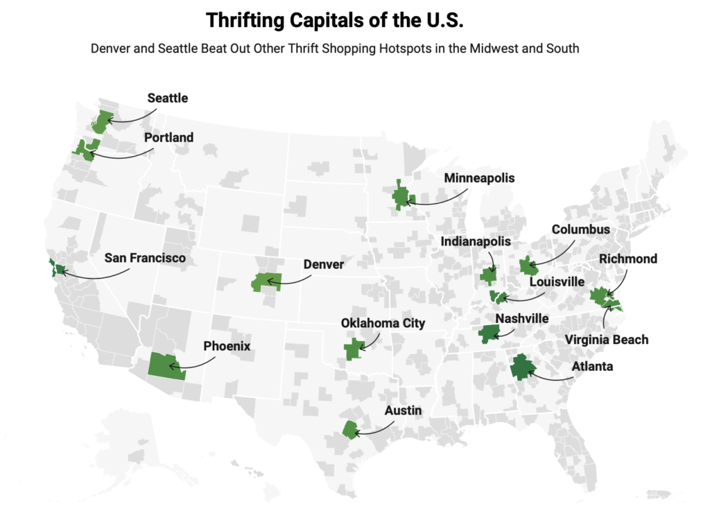 Claro, Minneapolis podría albergar el centro comercial más grande del país, que cubre casi 5 millones de pies cuadrados, pero también alberga innumerables boutiques encantadoras que combinan creatividad con vibraciones artísticas y búsqueda de gangas. Si visita The Golden Pearl Vintage, seguramente será recibido por hallazgos únicos de las décadas de 1920 a 1990. Del mismo modo, en Corner Store Vintage, donde abundan los artículos antiguos, llama la atención un mural de Jimi Hendrix. En general, el área metropolitana cuenta con 6 establecimientos de reventa/100 000 residentes, y casi un tercio de ellos son grandes.