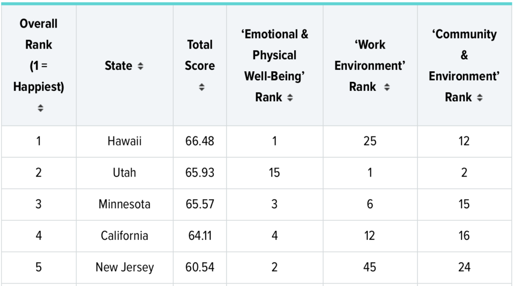 Para determinar dónde estadounidenses presentan la mejor combinación de estos factores, se examinaron los 50 estados en 31 indicadores clave, que van desde la depresión tasa a los deportes tasa de participación al crecimiento del ingreso.