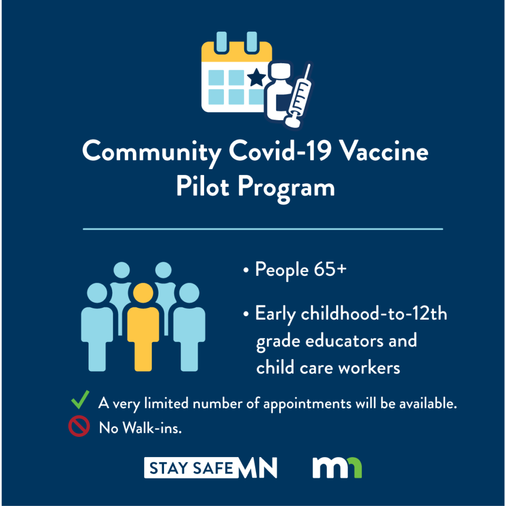 Desde este Martes al medio día, algunos habitantes de Minnesota elegibles para recibir una vacuna COVID-19 podrán inscribirse para citas en una de las nueve clínicas piloto de vacunación de la comunidad del estado a través de un nuevo sitio web y centro de llamadas lanzado hoy por el estado de Minnesota. Inicialmente, las clínicas atenderán a adultos de 65 años o más, así como a educadores, personal y trabajadores de cuidado infantil desde el jardín de infantes hasta el grado 12.