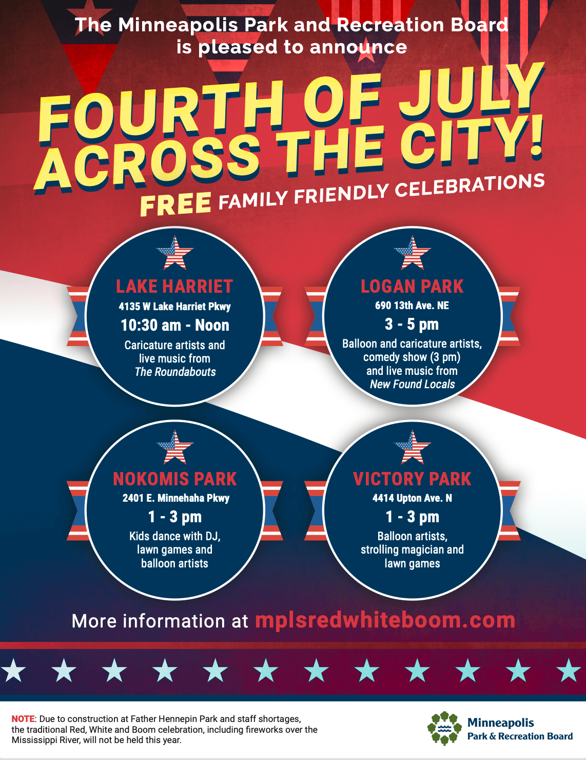Debido a la construcción en Father Hennepin Park y la escasez de personal, este año no se llevará a cabo la tradicional celebración Red, White and Boom, que incluye fuegos artificiales sobre el río Mississippi.