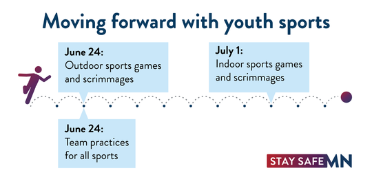 Una nueva guía sobre participación deportiva durante la pandemia COVID-19 ha sido planteada por el Departamento de Salud del Estado. Los juegos deportivos y juegos de práctica juveniles pueden reanudarse el 24 de junio o más tarde para deportes al aire libre , y el 1 de julio o más tarde para deportes en interioriores.