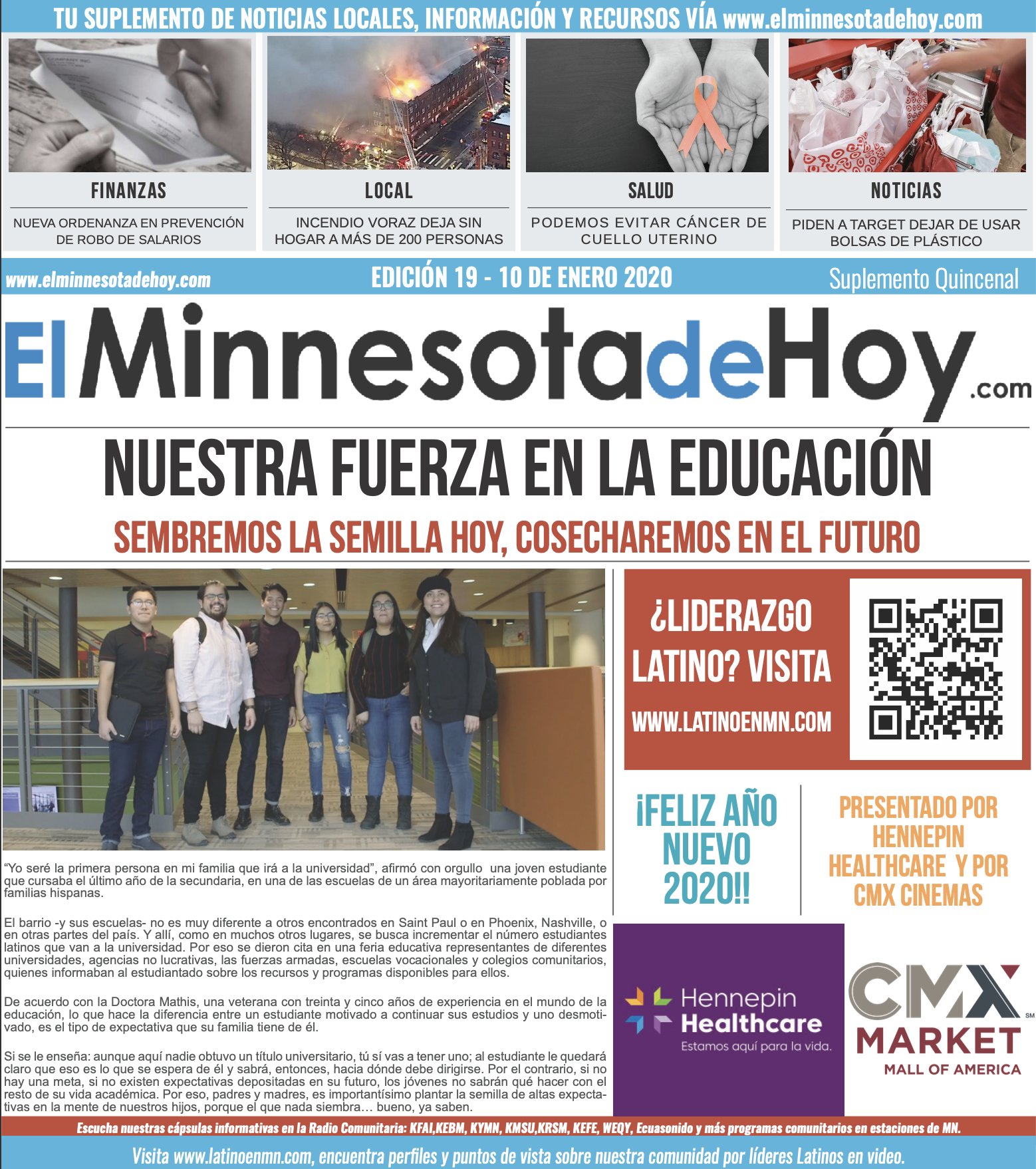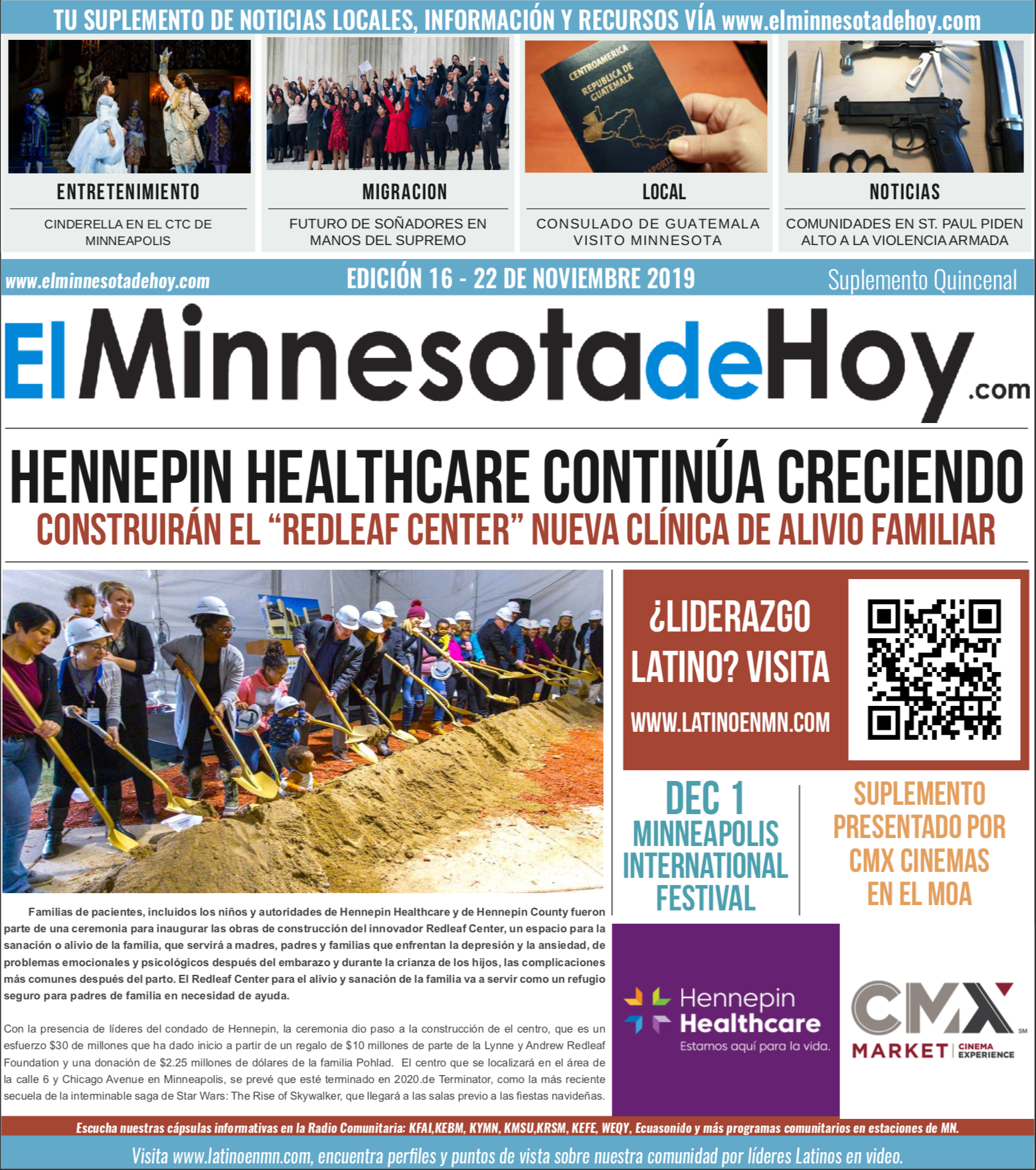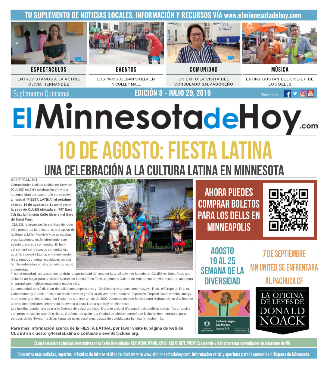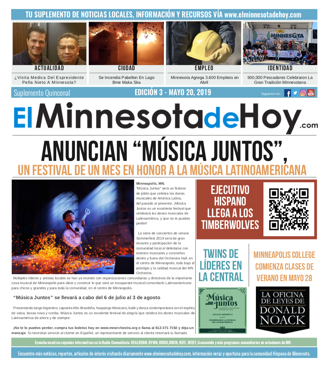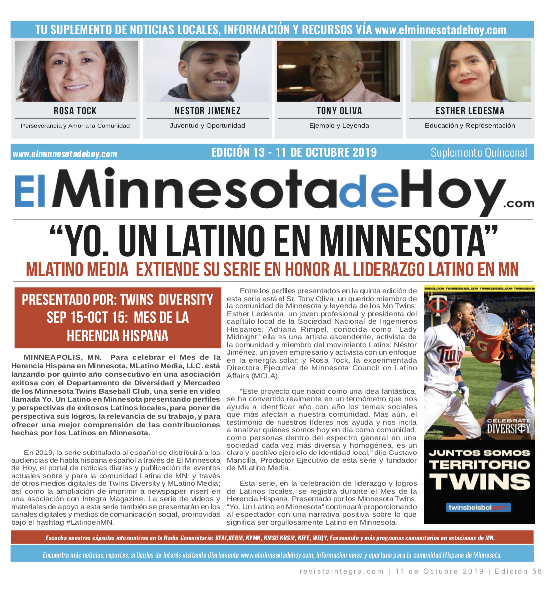 A print edition of El Minnesota de Hoy produced by MLatino Media became available since the month of April 2019. A bi-weekly #MNHoy insert, featured in Revista Integra, highlights top local news and stories directly from our daily news website. www.elminnesotadehoy.com