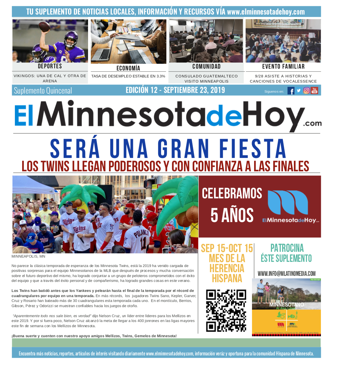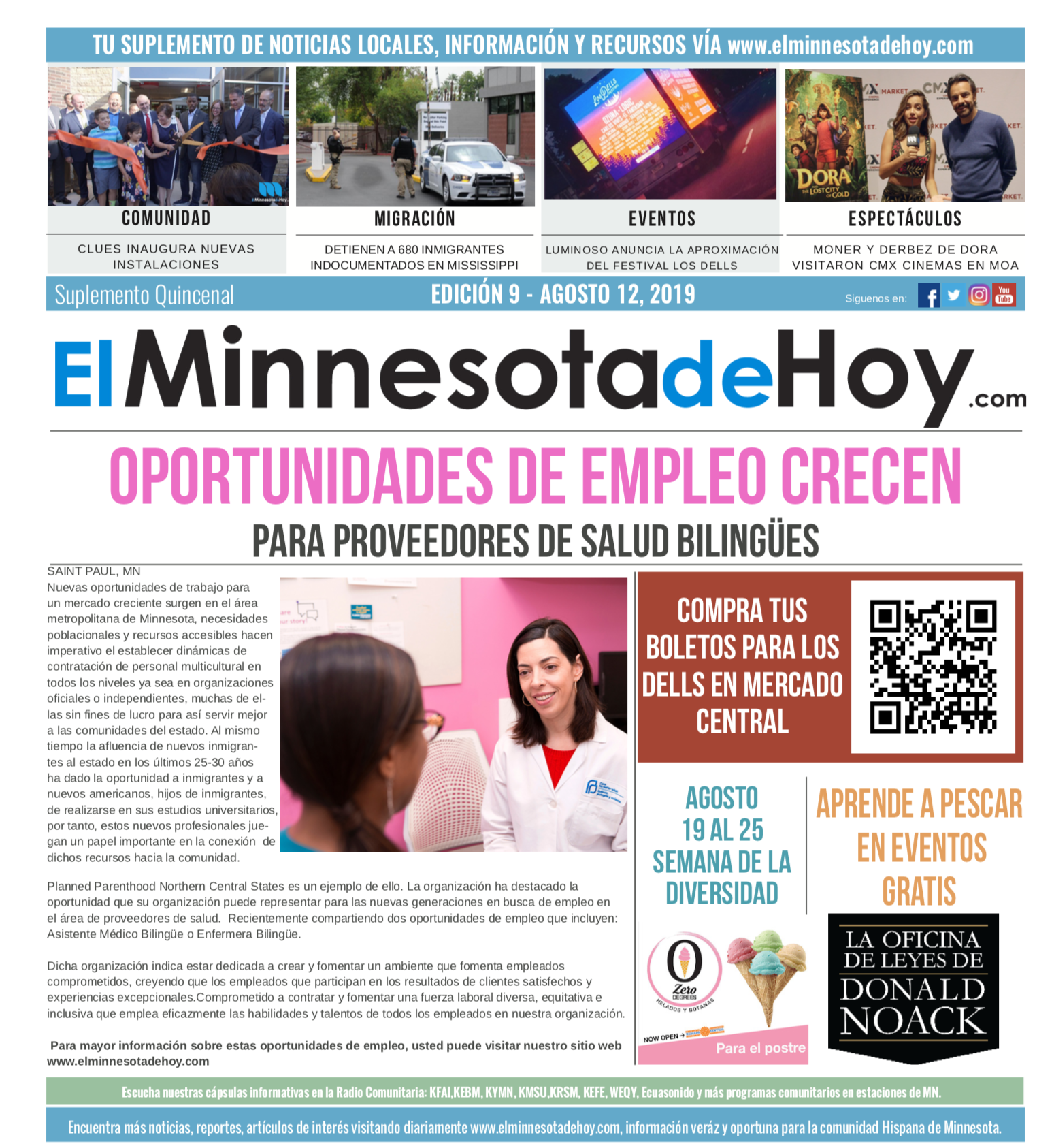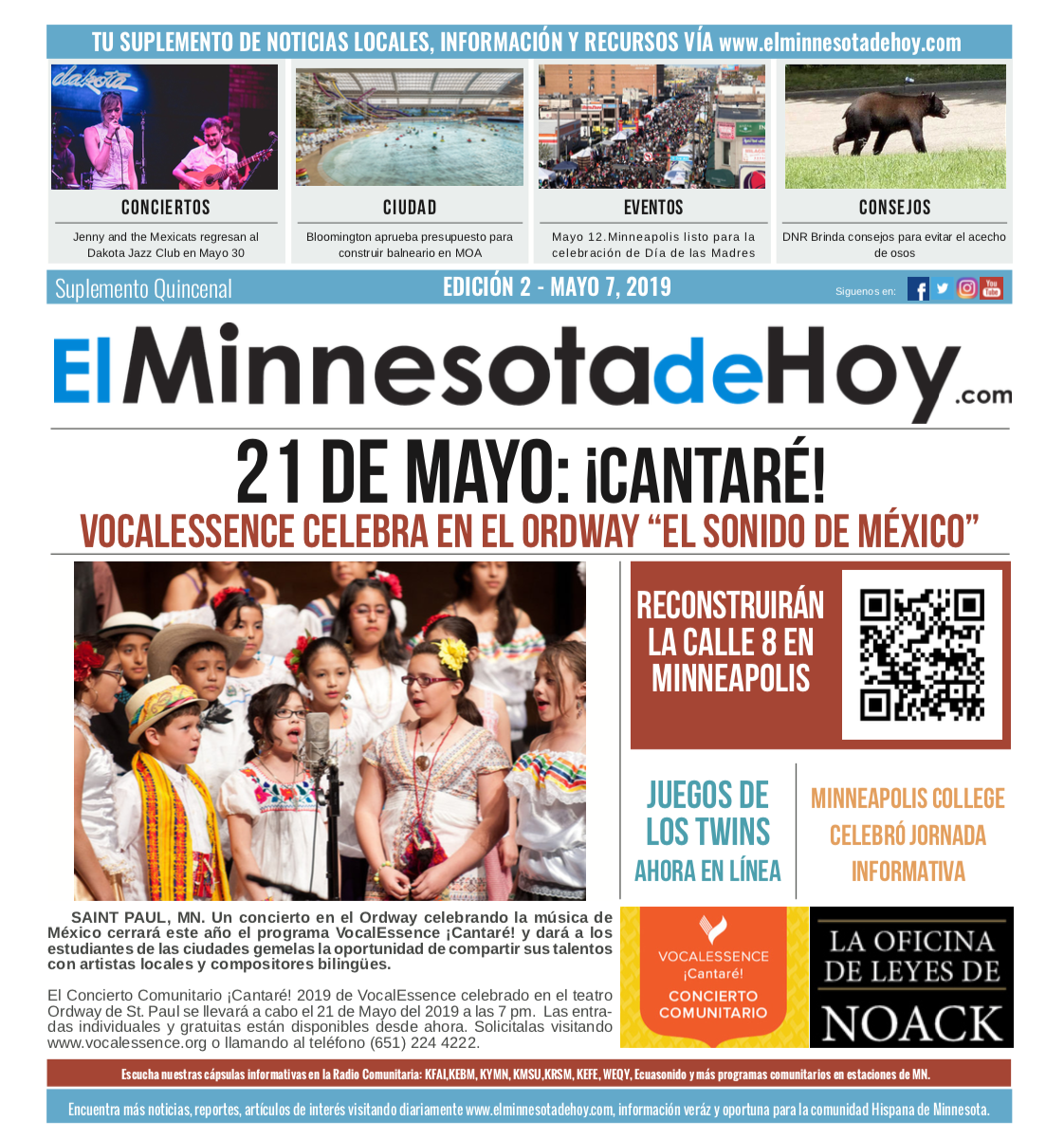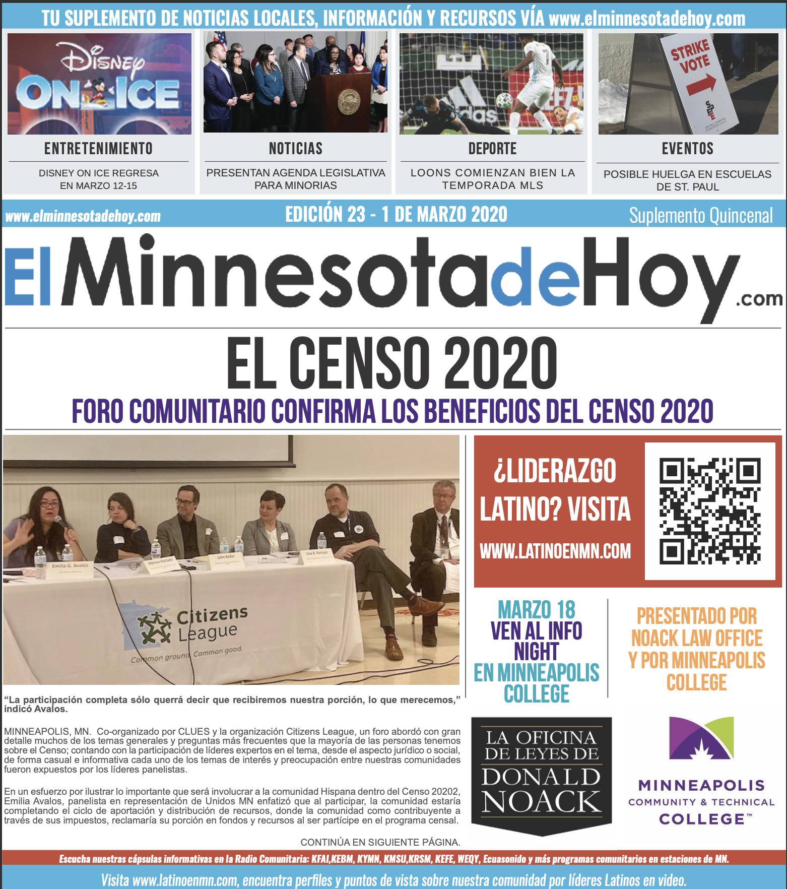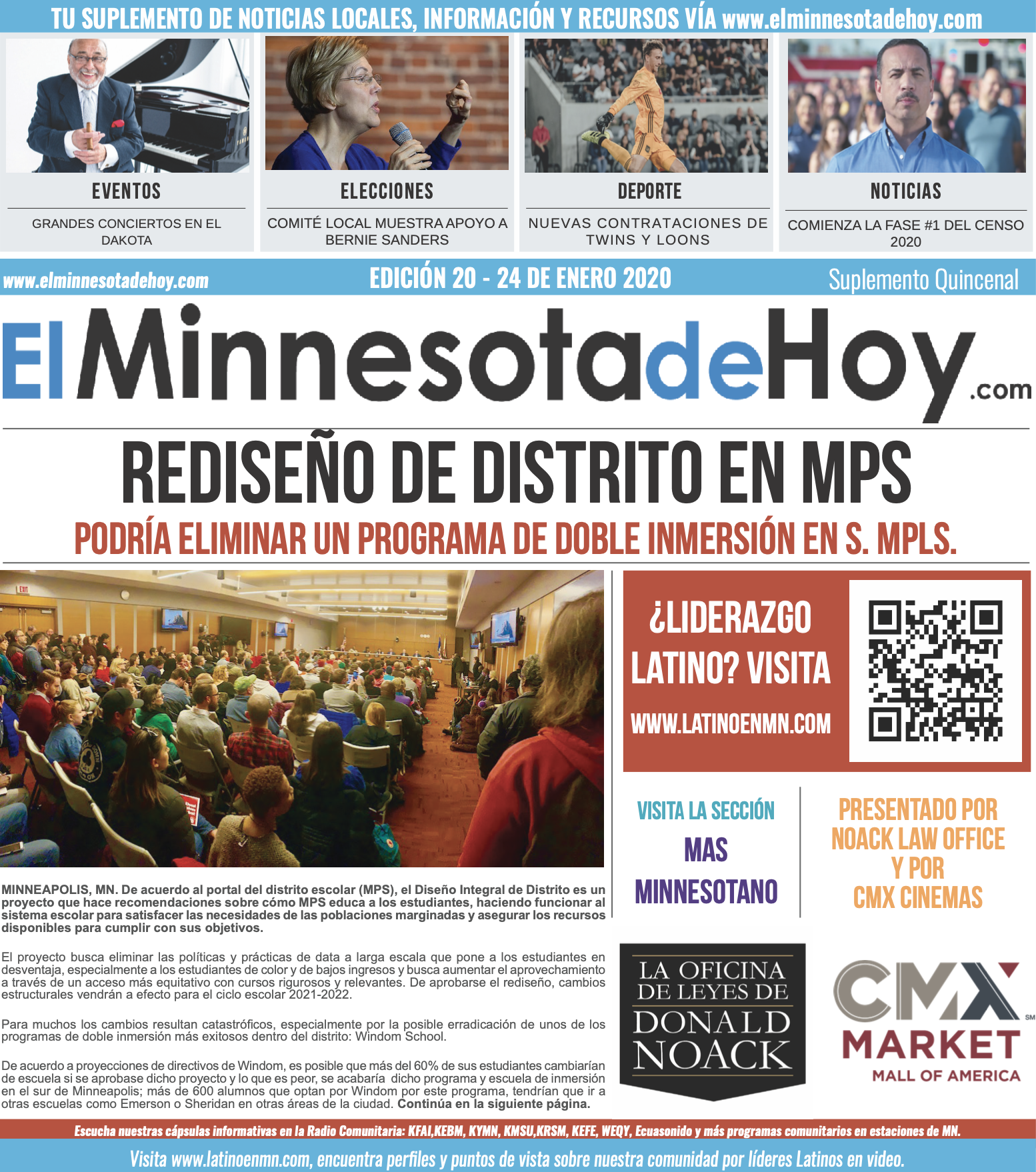 A print edition of El Minnesota de Hoy produced by MLatino Media became available since the month of April 2019. A bi-weekly #MNHoy insert, featured in Revista Integra, highlights top local news and stories directly from our daily news website. www.elminnesotadehoy.com