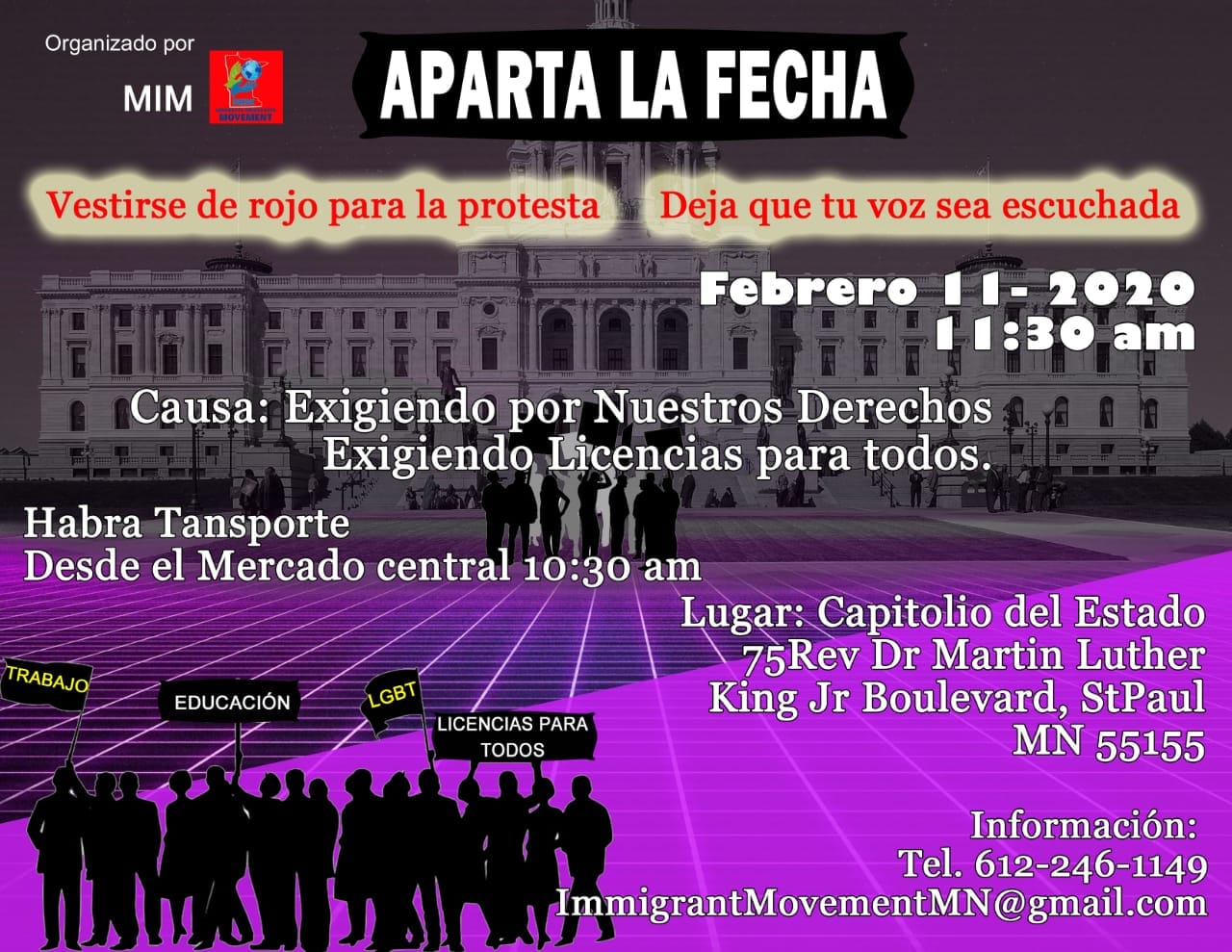 La protesta marcará el inicio de la acción de muchas organizaciones con vías a la discusión y convencimiento a legisladores durante el periodo legislativo 2020 que esta a punto de comenzar. La información proporcionada a El Minnesota de Hoy por parte de la organización MIRAC es la siguiente:
