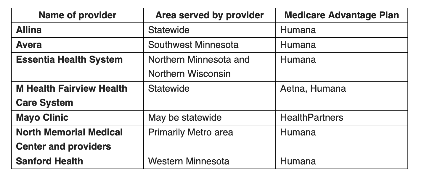 Este año, varios proveedores de atención médica en Minnesota decidieron no aceptar planes Medicare Advantage específicos. Consultar a un proveedor que no acepte su plan Medicare Advantage podría resultar en una atención con un costo de bolsillo mucho más alto o una atención que no esté cubierta en absoluto. El resultado es que los habitantes de Minnesota con planes Medicare Advantage pueden tener opciones radicalmente diferentes en cuanto a proveedores de atención médica bajo esos planes. Esto incluye la posibilidad de que un proveedor que una persona con Medicare Advantage haya consultado este año, o incluso durante varios años, ya no acepte el plan Medicare Advantage de esa persona el año próximo.